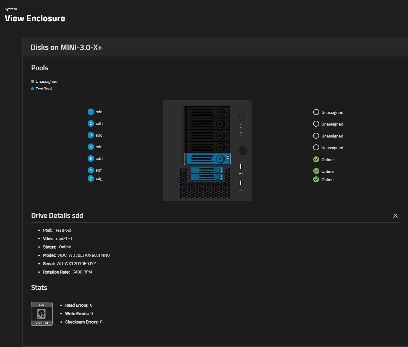 The View Enclosure screen only displays on compatible TrueNAS hardware. The UI options to select System > Enclosure is not present on incompatible systems.