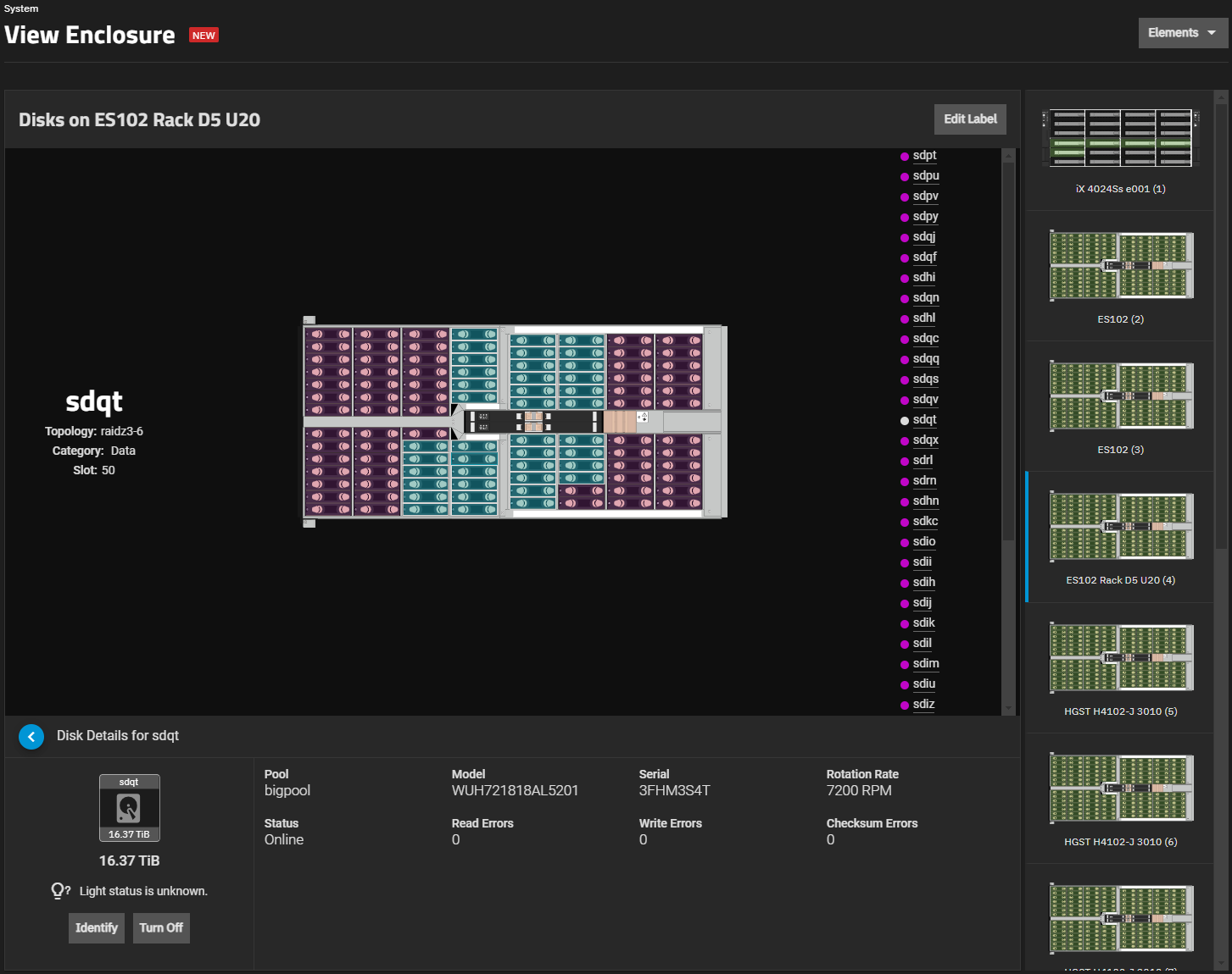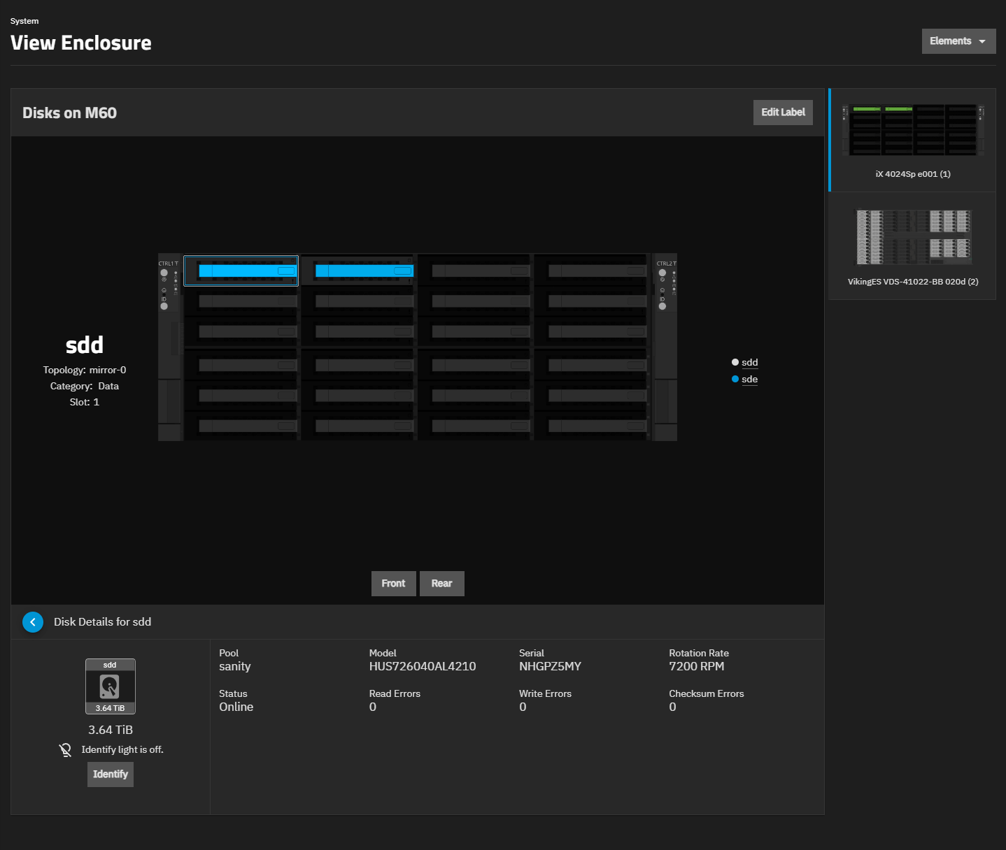 Identify on disk detail screens turns on the LED indicator located on a physical drive bay in the system server. This helps to identify the physical drive bay that corresponds to the TrueNAS identification number for that drive. Select the drive on the image and then click Identify. Go to the location of the system server to locate the drive bay with the LED indication turned on, then check the drive location on the View Enclosure screen.