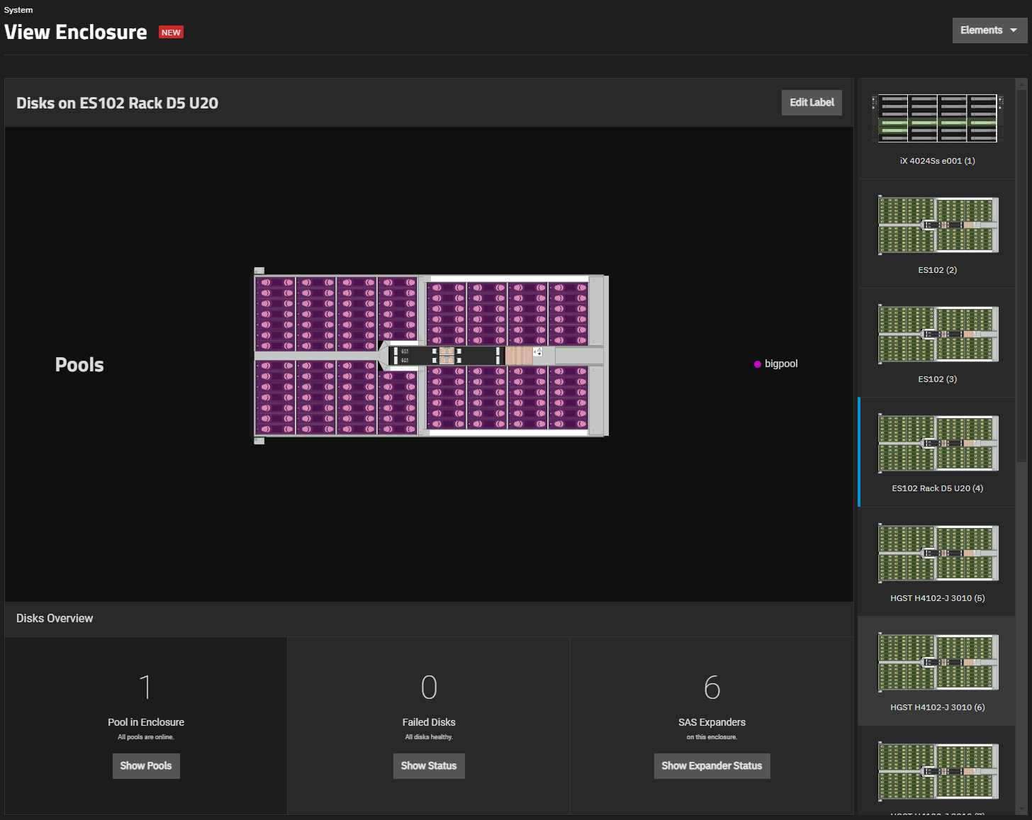 The right side of the screen includes smaller thumbnail images of both the main system and any expansion shelves connected to the system. A blue vertical line to the left of the thumbnail image indicates the selected enclosure.