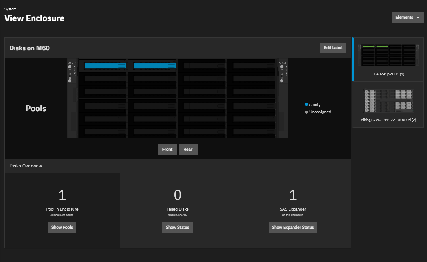 The Elements button at the top right of the View Enclosure screen displays a dropdown list of options to view information about the system or expansion shelf. The options vary by TrueNAS platform, if the system is connected to expansion shelves, and if you have an expansion shelf image selected instead of the main system. All TrueNAS systems include the Disks option. TrueNAS systems with expansion shelves include the Temperature, Power Supply, and Voltage options. The expansion shelf includes the Disks, Cooling, Services, Power Supply, SAS, Temperature, and Voltage options. Each option displays a table with readings from the system’s internal components taken over a period of time.
