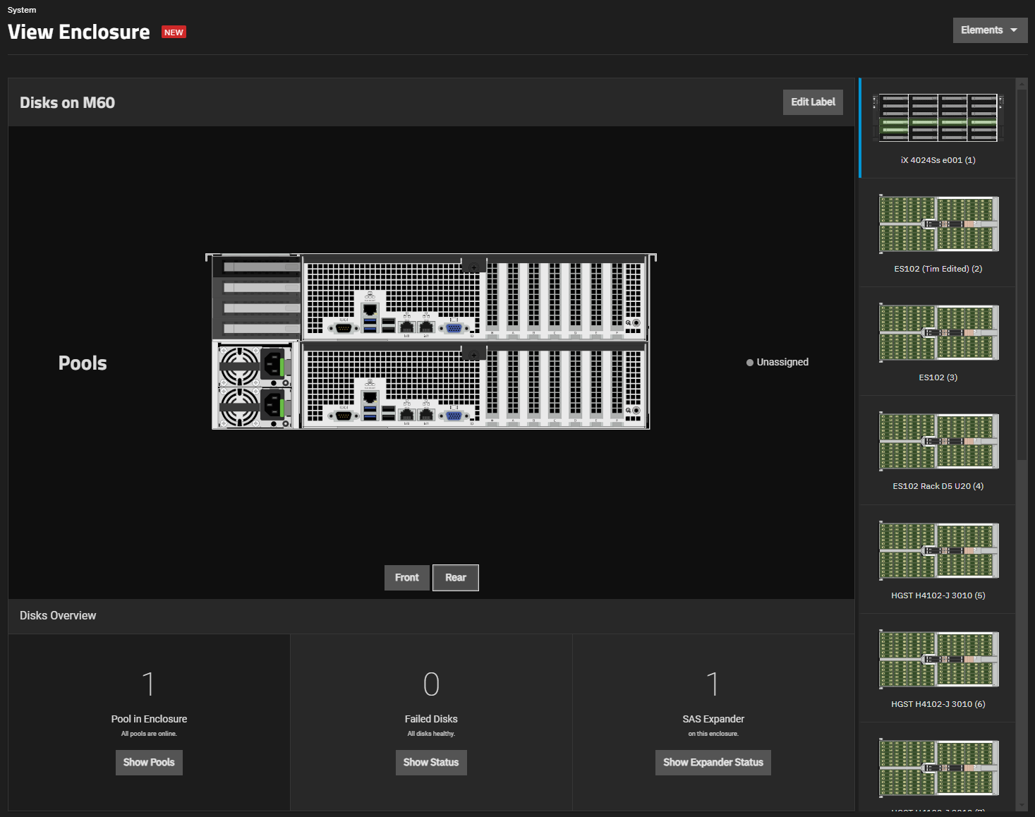 Larger TrueNAS Enterprise system images include a front and rear view of the chassis. The screen opens showing the front view by default.