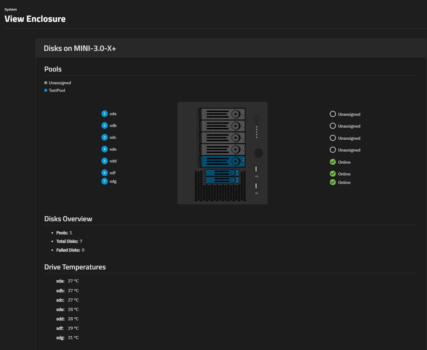 Pool information displays at the top of the screen. The drive bay number and disk label displays to the left of the image and the status to the right of the image. The Disk Overview section provides general details about the system drive hardware and capacity. Drive Temperatures displays current readings for each drive in the system.