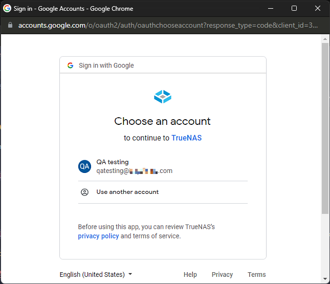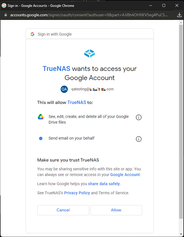 When the TrueNAS wants to access your Google Account window opens, scroll down and click Allow to complete the setup or Cancel to exit setup and close the window.