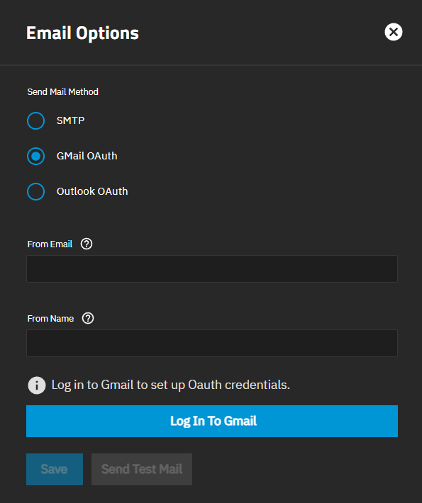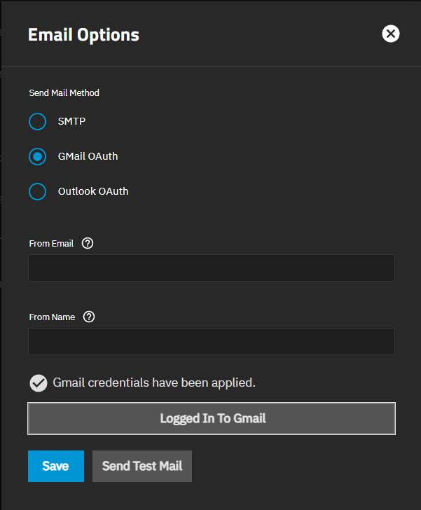 After setting up Gmail OAuth authentication, the Email Options screen displays Gmail credentials have been applied, and the button changes to Log In To Gmail Again.