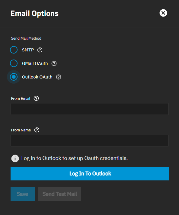 After setting up Outlook OAuth authentication, the Email Options screen shows Outlook credentials have been applied and the button changes to Logged In To Outlook.