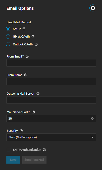 Select SMTP Authentication for TrueNAS to reuse authentication credentials from the SMTP server. Enter the SMTP credentials in the new fields that appear. Typically, Username is the full email address, and Password is the password for that account.