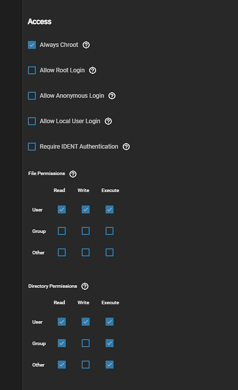 | Always Chroot | When selected, restricts all local users to their home directory regardless of group membership. This option increases security risk — chroot jails can be escaped if users have write access to their home directory, potentially exposing the broader filesystem. Enable TLS when possible (especially when exposing FTP to a WAN). TLS effectively makes this FTPS for better security. |