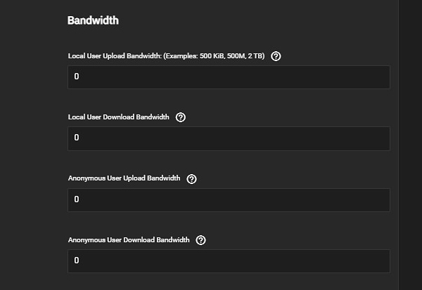 | Anonymous User Upload Bandwidth | Enter a value in KiBs or greater. A default of 0 Kib means unlimited. If you do not specify a measurement, it defaults to KiB. This field accepts human-readable input in KiBs or greater (M, GiB, TB, etc.). The default 0 KiB is unlimited. |