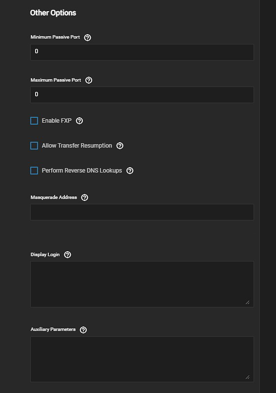 | Auxiliary Parameters | Used to add additional proftpd(8) parameters. |