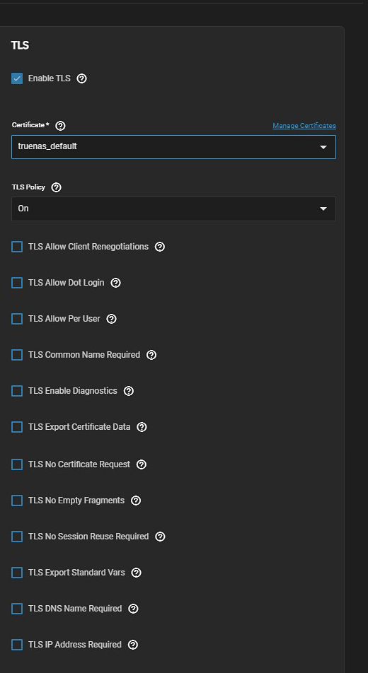 | TLS Allow Dot Login | TrueNAS checks the user home directory for a |