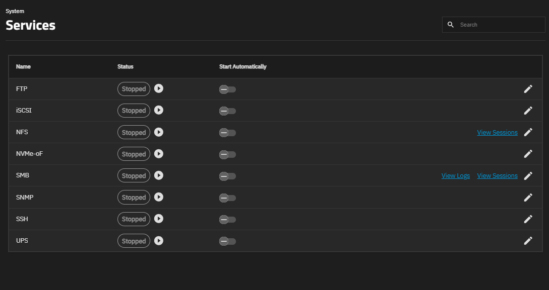 System > Services displays each system component that runs continuously in the background. These typically control data-sharing or other external access to the system. Individual services have configuration screens, activation buttons, and you can set them to run automatically.