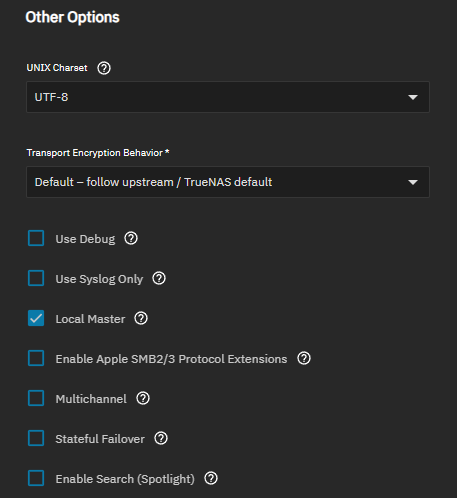 | Enable Apple SMB2/3 Protocol Extensions | Select to allow MacOS to use these protocol extensions to improve the performance and behavioral characteristics of SMB shares. TrueNAS requires Apple SMB2/3 protocol extensions for Time Machine support and Final Cut Pro Storage Share workflows. You must enable this setting before creating shares with the Time Machine Share or Final Cut Pro Storage Share purpose options. |