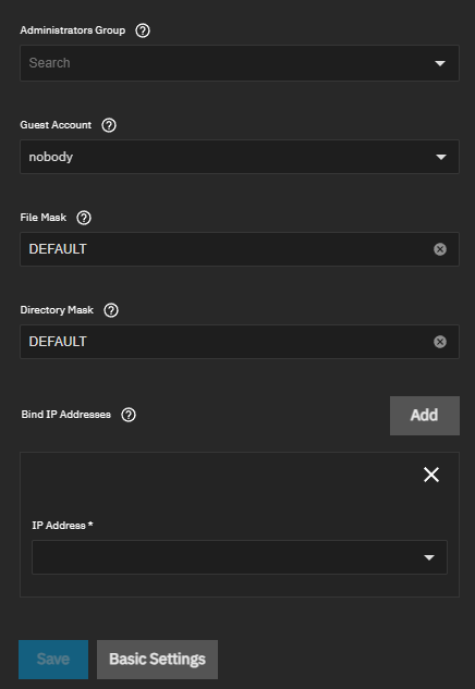 | Bind IP Addresses | Click Add to specify static IP addresses that SMB listens on for connections. Select an IP address from the dropdown list for each entry. Leaving this empty defaults to listening on all active interfaces. |