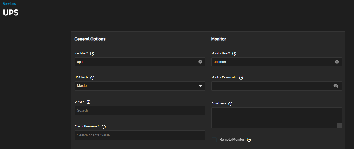 | UPS Mode | Select the either Master or Slave mode from the dropdown list. Select Master if the UPS is plugged directly into the system serial port, or Slave to shut down this system before the master system. Slave displays the Remote Hostname and Remote Port fields, and removes the Driver field. The UPS remains the last item to shut down. See the Network UPS Tools Overview. |