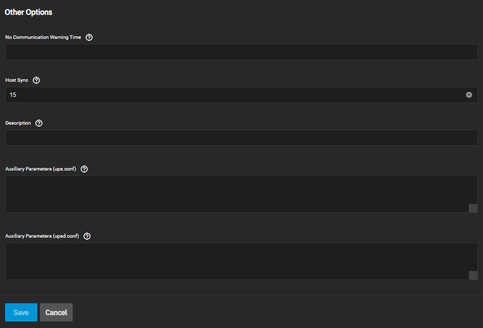 | Auxiliary Parameters (upsd.conf) | Enter any extra options from upsd.conf. |