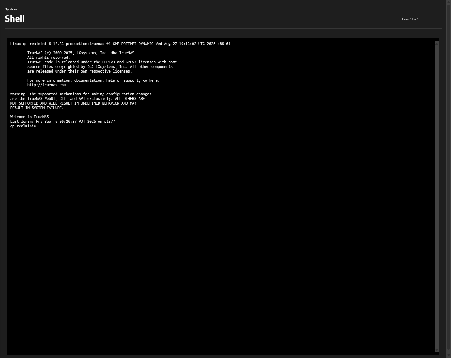 The TrueNAS Shell is convenient for running command line tools, configuring different system settings, or finding log files and debug information.