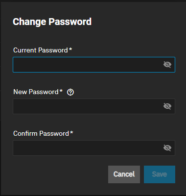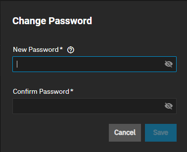 The truenas_admin user and admin users with full control permissions see the Change Password dialog with the New Password and Confirm Password fields. These users do not need to enter their current password to change the password.