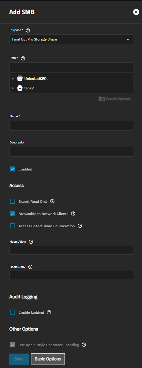 | Use Apple-style Character Encoding | Implements the default hashing algorithm for NTFS illegal characters that Samba uses. Enabling this option translates NTFS illegal characters to the Unicode private range. Shows for all share types except when Purpose is set to the Time Machine Share or External Share. |