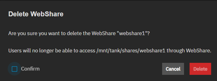 The delete icon opens a Delete confirmation dialog. The dialog shows the name of the share, and a warning message about deleting the WebShare.