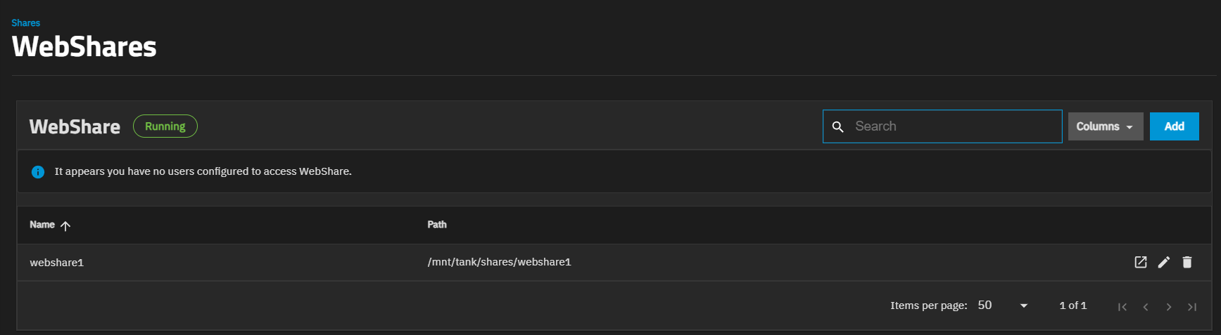 After adding an WebShare share, it is listed in the table on the widget.