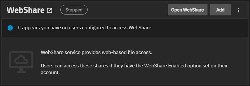 The WebShare header shows the status of the WebShare service as either Stopped (red) or Running (green). Before adding the first share, the Stopped status displays in the default color. The header is a link that opens the Sharing > WebShare screen.
