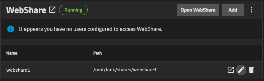 Each Webshare share row shows the share name, the path to the shared dataset, and three icons: