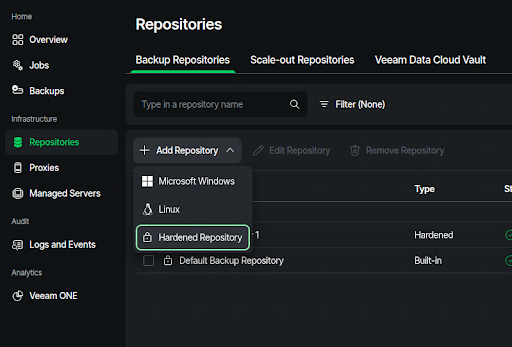 - A Veeam Backup & Replication environment. The hardened repository integrates with both traditional Windows-based and new Linux-based software appliance deployments.